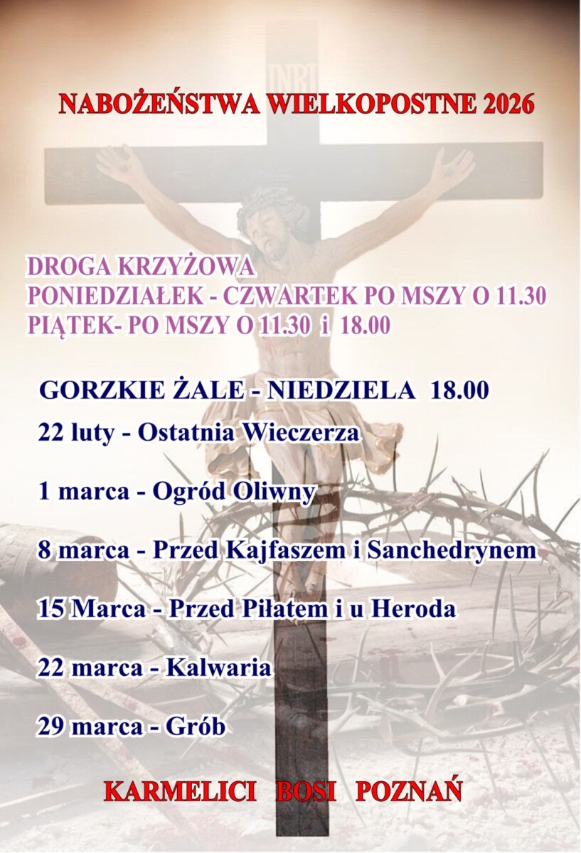 aktualności klasztoru Poznań wróć WIELKI POST 18 lutego, 2026 podziel siępodobne posty Aktualności Przekaż nam 1,5 % podatku 23 stycznia, 2026 Poniżej podajemy link do „siepomaga”… Aktualności Przekaż nam 1,5 % podatku 23 stycznia, 2026 Poniżej podajemy link do „siepomaga”… Aktualności Dorzuć się do skarbonki! 19 października, 2025 Dorzuć się do skarbonki! Wesprzyj… Aktualności Dorzuć się do skarbonki! 19 października, 2025 Dorzuć się do skarbonki! Wesprzyj… Aktualności Okna dla bosych 3 września, 2025 English Español … Aktualności Okna dla bosych 3 września, 2025 English Español …